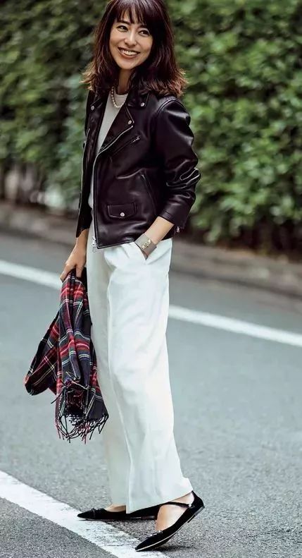 选择大方清爽颜色的衣服,机车皮衣干净利落,搭配白色长裤稳重干练。