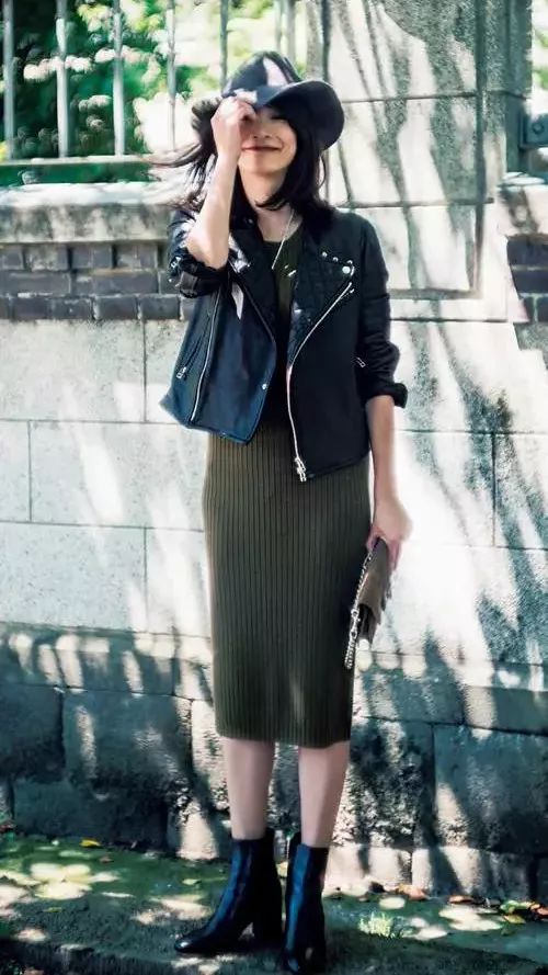 除了精致女人味,也可以用针织裙+皮衣变身酷女孩,同色系踝靴让搭配更具酷辣感。