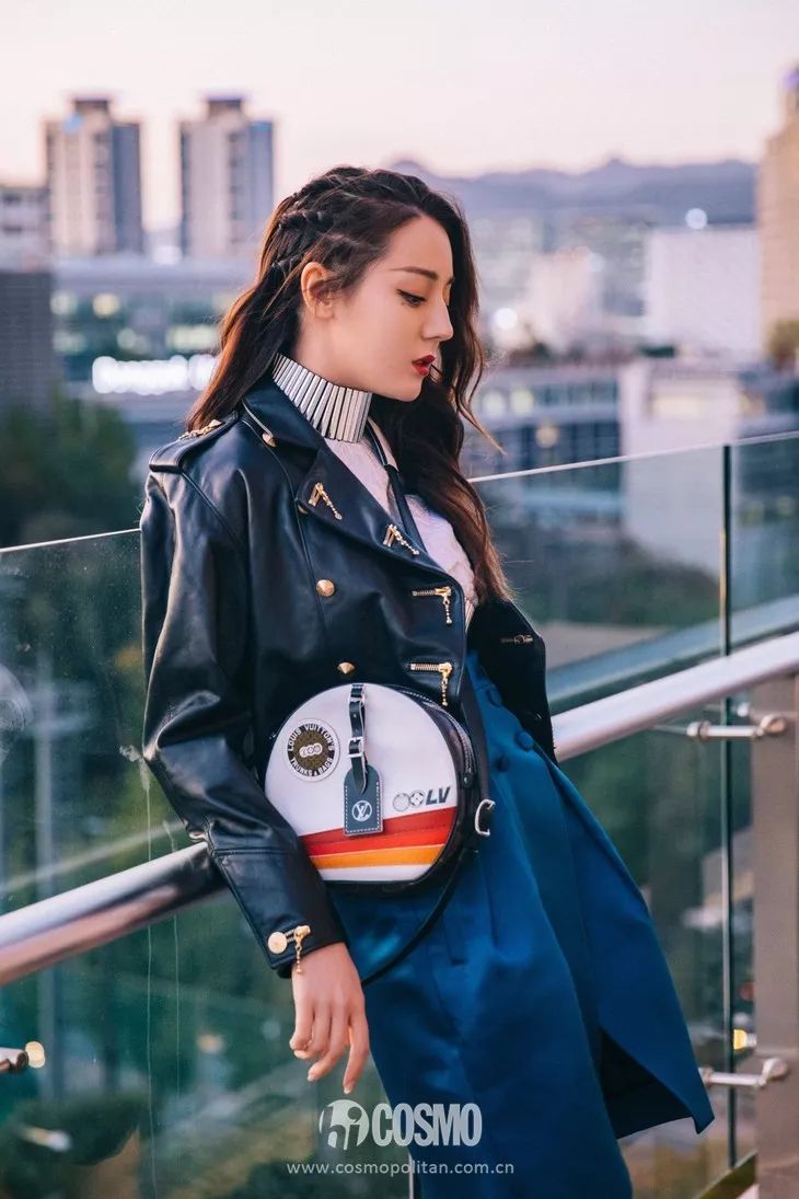 迪丽热巴也背了一只,搭配超酷的皮夹克和蓝色缎面裙,摩登又有型。