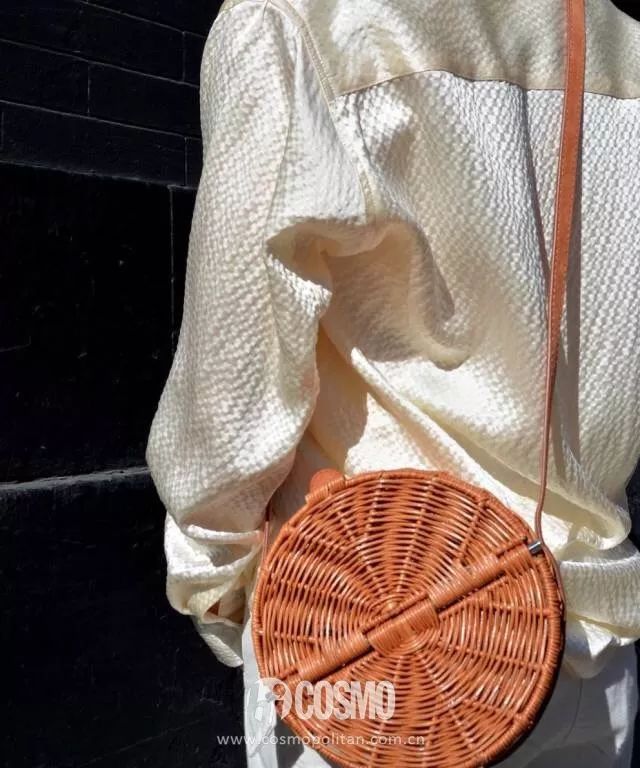 这款草编小圆包肩带选用的是小牛皮,选用的颜色和编法复古十足。
