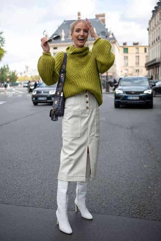 绿色本就是今年的“热门大户”,荧光绿觉得先黑hold不住,那试试抹茶绿?明度没有那么强的绿色反而会让皮肤显白,搭配一条白色半裙也太~法~式啦!(而且这种颜色和浅色头发搭起来也很好看,染发的小姐妹可以试试)