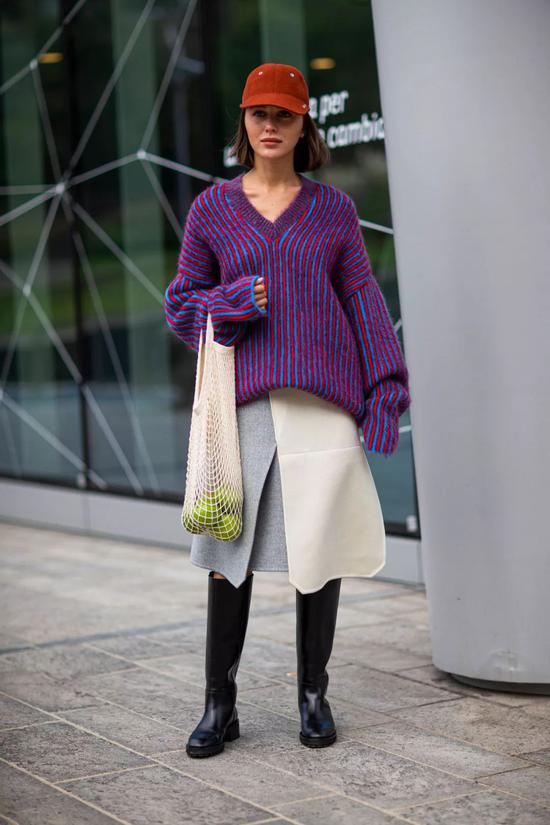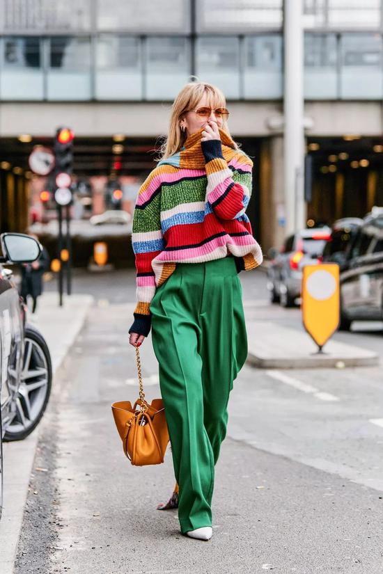 横条纹拼色的毛衣更适合肩窄的女孩子们,线条可以视觉上拉宽上身比例,整体看上去更协调。对比度高的颜色撞色肤色偏白的更容易hold住,让一身的搭配更有看点。