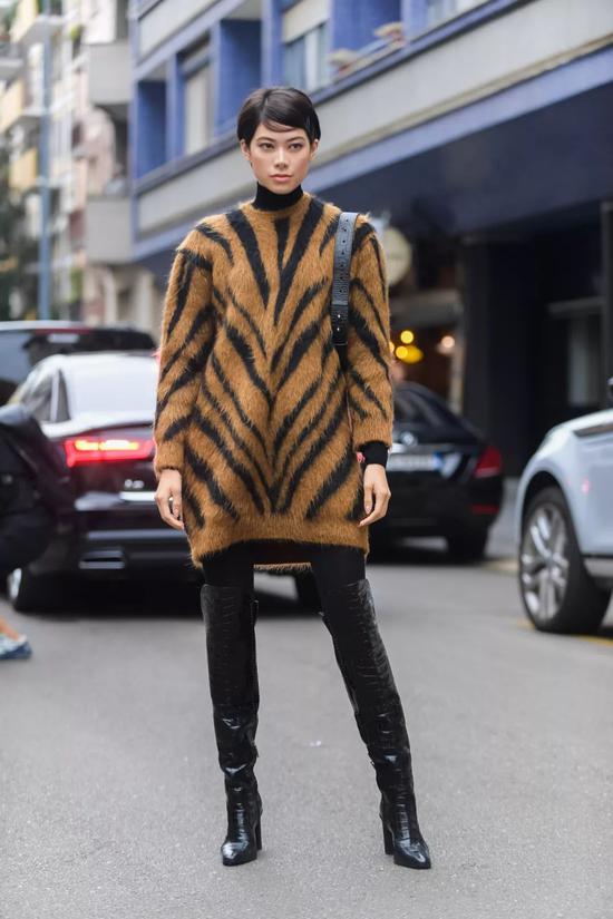斑马纹的颜色跟毛毛质感的材质更配哦!深色的拼接时大部分人都能穿出效果的好看。再搭配一双漆皮长靴,就是“气场女王”。