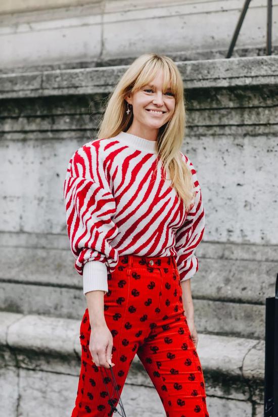 颜色鲜艳一点的白红斑马纹也是个不错的选择~泡泡袖还可以遮住“麒麟臂”(冬天真好!)日常的时候可以搭配低调一点颜色的半裙或者长裤,更适合亚洲女孩~