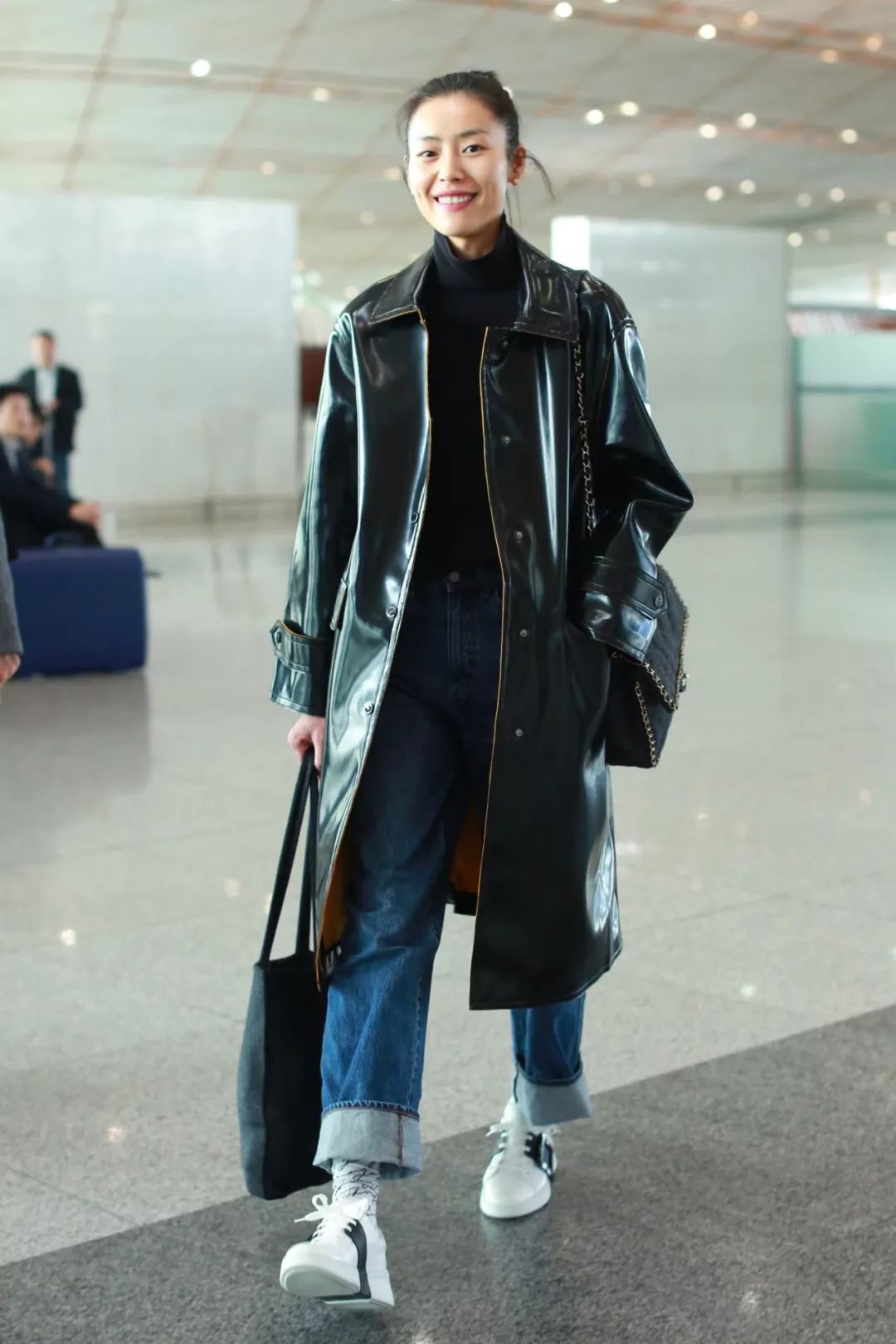 时尚圈走秀下班小刘则是用高领毛衣搭配“老爹裤“的高级穿法,外面再套一件皮质风衣外套,H型的高妹们,这一套太值得你们copy了,简直是“行走的模卡”。