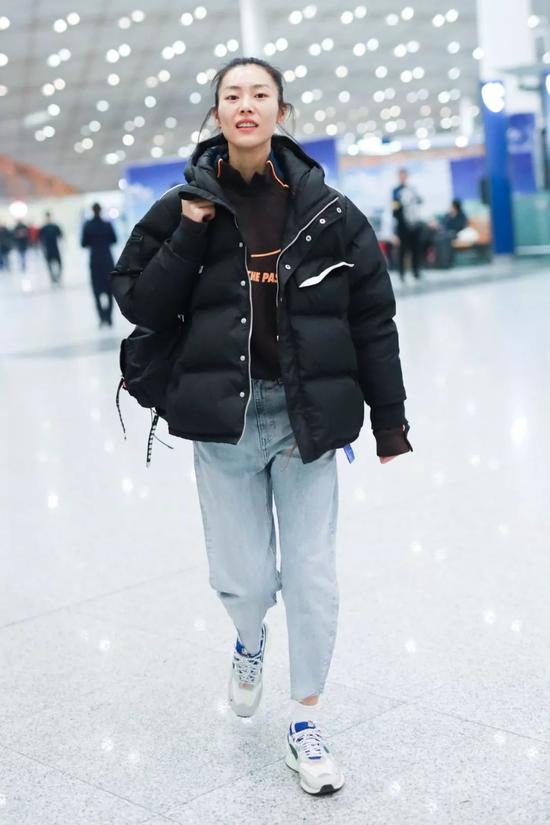 同样是羽绒服look,大表姐用一条“老妈裤”把黑色羽绒服穿出了boylish的味道。九分的裤子会给厚重的上衣“减减负“,整体会看起来更轻巧些。
