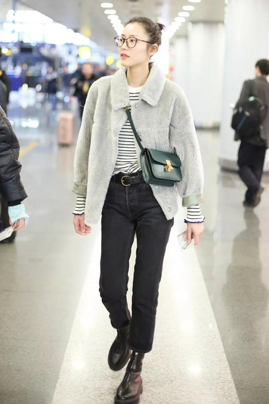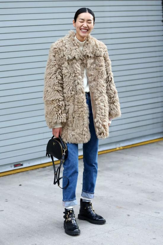 厚重质感的毛毛外套,也可以像刘雯一样搭配Skinny Jeans来“减负”,裤腿挽起来搭配一双机车短靴,毛毛外套也能mix match出街头感。