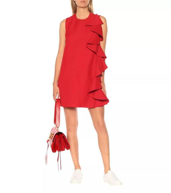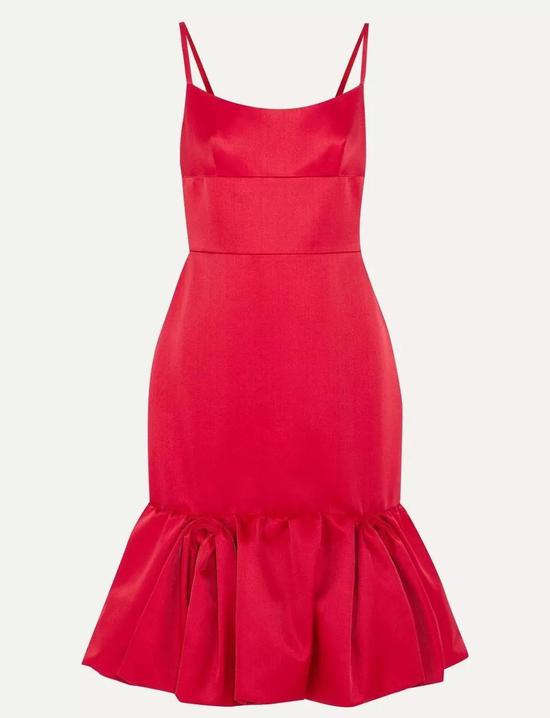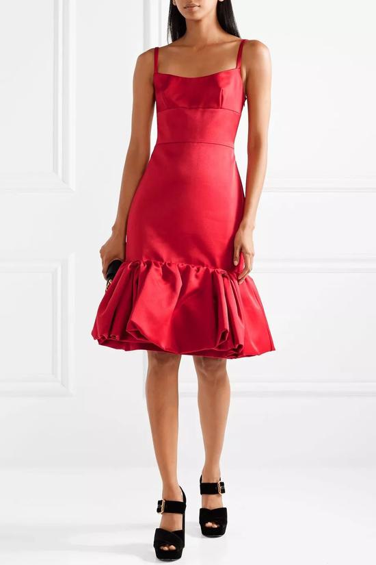 Prada 这款 50 年代风的红色连衣裙由羊毛真丝混纺的面料剪裁完成,带有柔和起伏的装饰裙摆,强调着面料独有的光泽。细肩带和腰部的拼接平衡着下摆的丰盈廓形,所以格外显身材,对梨形身材也是特别友好呢~