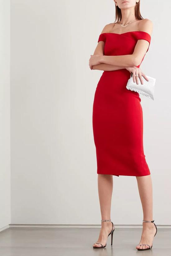 Roland Mouret 这款 “Amarula” 连衣裙设有露肩领口,如果是锁骨好看的仙女,穿这条是最能凸显优势的。再偷偷告诉你,一字肩的领可以让你放心大胆展示珠!宝!🤫建议搭配黑色高袢带跟鞋,简简单单就美到不行!~~