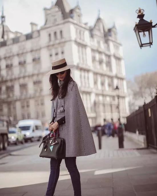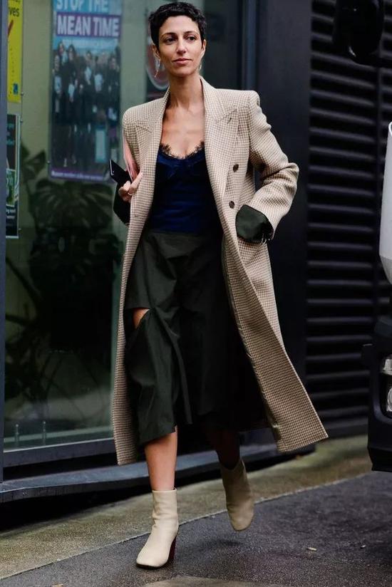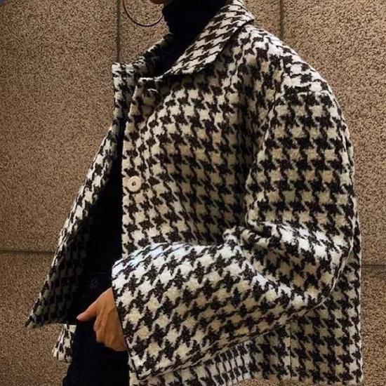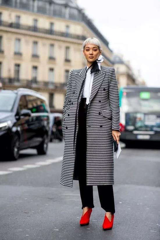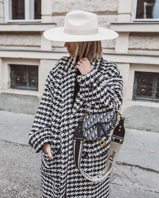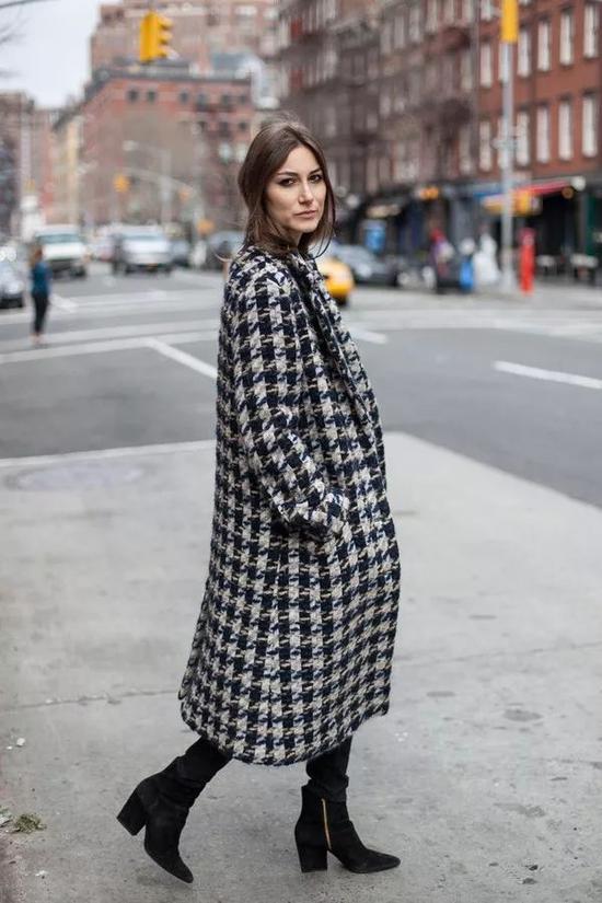冬季的最佳单品当属千鸟格外套,长款大衣非常拉风,搭配短靴展现十足女性气质;