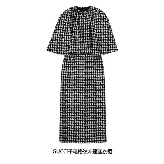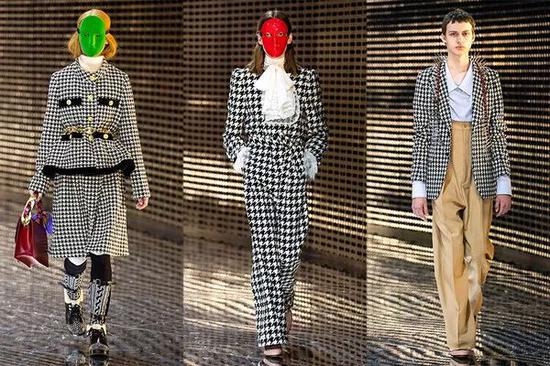经典的千鸟格套装在Gucci的秀场中,以一些怪诞出奇的配饰来衬托,则显得浪漫不羁。