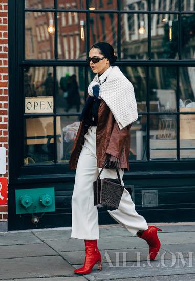 一双颜色出挑的红色短靴有点高调,搭配黑色裤子会显得有点老气,搭配白色长裤就能轻松解决这个问题。还能与上半身的深色穿搭呼应得很和谐。