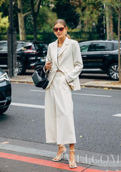 九分或者八分长度的阔腿裤露出脚踝,让整体造型更加轻盈。搭配稍显oversize的白色西装,职场女王look也不过如此。