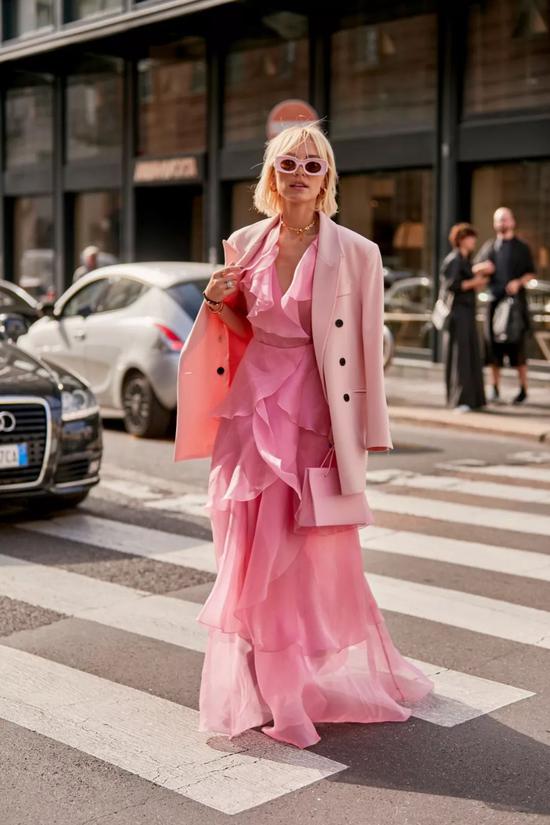 据说年纪大了,就会慢慢开始喜欢粉色~不管怎么说,粉色一定是春天必不可少的颜色啦!要说同色系穿搭,应该是最好搭配还最显高级的穿搭,软糯飘逸的花瓣雪纺裙和偏硬朗的西服放在一起,“调和”的柔美刚刚好👌