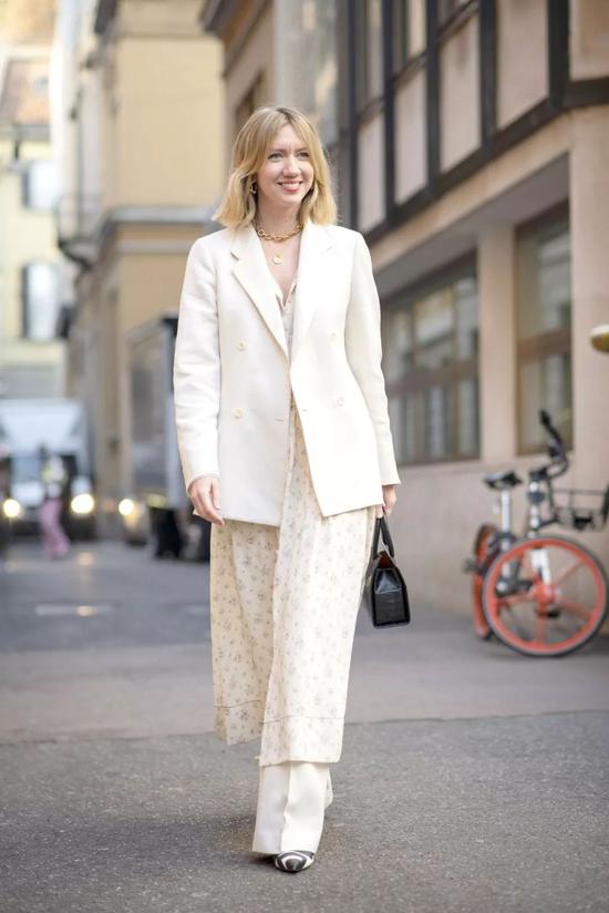 没有一个春天可以拒绝白色和印花!白色西装和碎花裙放在一起,你就是“人间冰淇淋🍦”,个高条顺的还可以尝试里面加一条西裤的高阶穿搭~