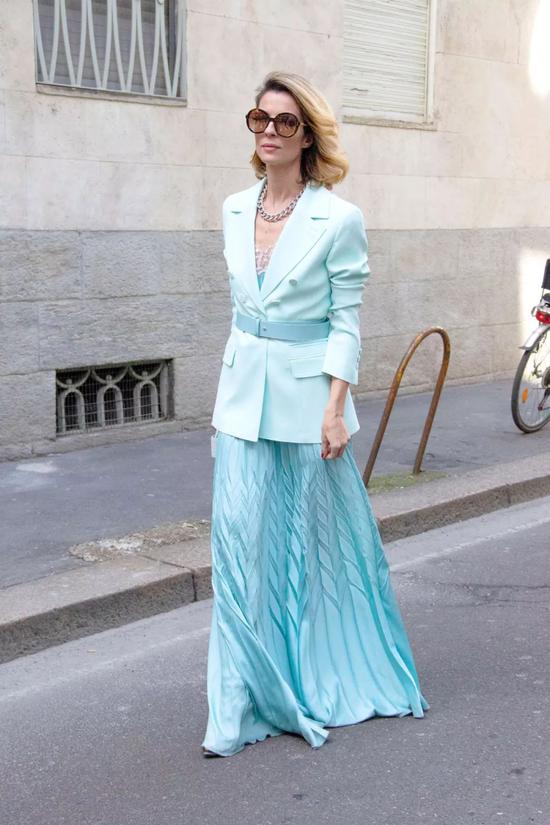 马卡龙色系的温柔,在穿上身的那一刻就懂了。马卡龙蓝色的百褶裙搭配同色系的西装外套,要多温柔有多温柔。怕百褶裙的垂感太重会让身材的感觉往下走?一条腰带就帮你解决了。稍加一些金属配饰,更显整体质感。