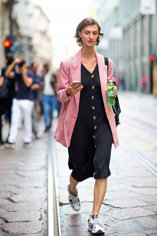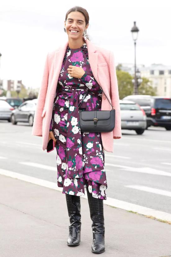 粉色不仅可以同色系搭配,单拎出来也是一样“春天”。搭配一条碎花的连衣裙,优雅满分。深色的连衣裙搭配一双黑色的长靴,这么穿去时装周都被拍。