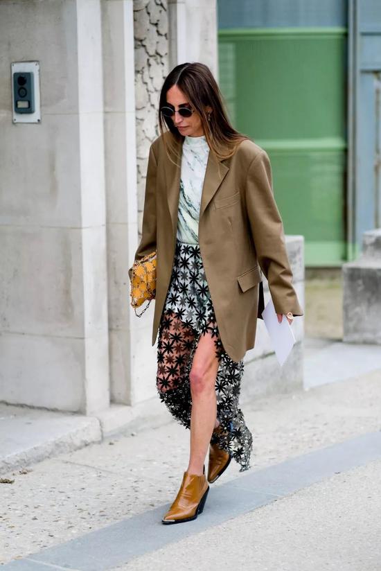 走“大女主”路线的,驼色西装里可以搭配一件冷色调的连衣裙,镂空的元素还可以增加一丝小性感。