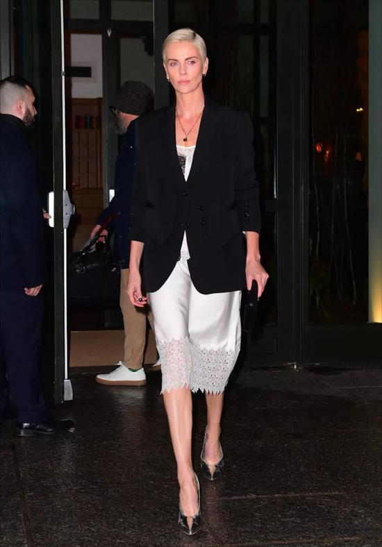 黑西服只会搭白衬衫就太小白了,像查理兹·塞隆一样里面搭配一条丝绸连衣裙,整体立马曼妙了起来~