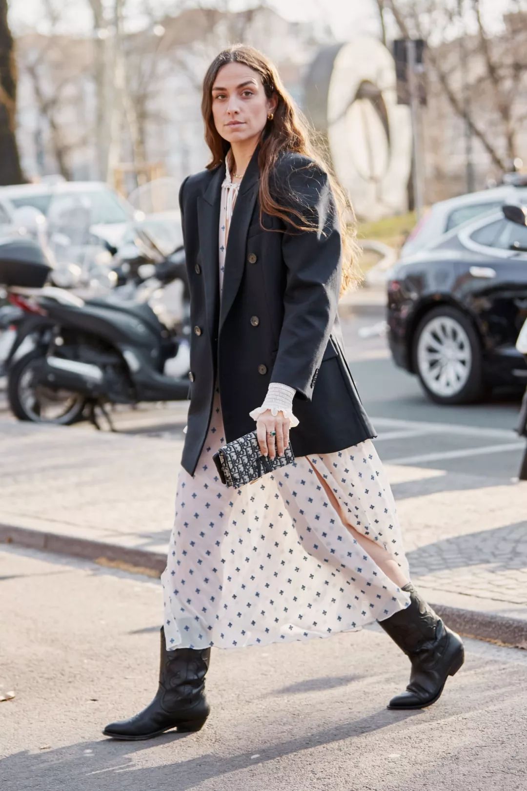 少女款的雪纺连衣裙外面搭配一件黑色西装也是碰撞出更有时髦感,黑色的外套给LOOK增加一些重感,带着硬朗的小甜美,简直是帅气撩人都有啦!再才一双今年流行的牛仔靴,少女裙也能穿出大气的感觉。
