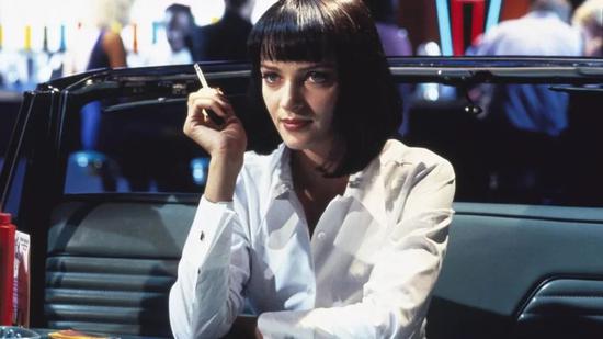 《低俗小说》里乌玛瑟曼用大红色指甲油、红唇和Bob头,诠释了白衬衫另一个危险、潮湿的版本,她身上的白衬衫也并不花俏,但是一个尖领子就足够把她的sharp表现出来。