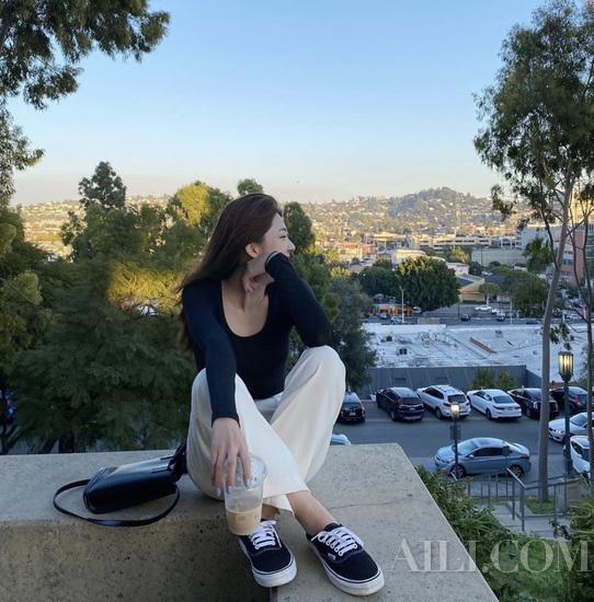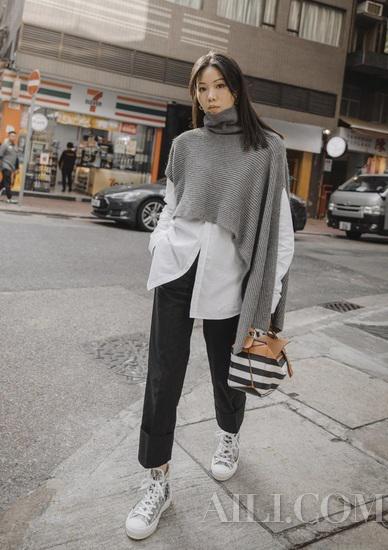 露出脚踝的黑色帆布鞋朴素又轻盈,不论是搭配裤装还是裙装,它都做一个完美的配角,不会抢了其他单品的风头,给人温柔又内敛的感觉。