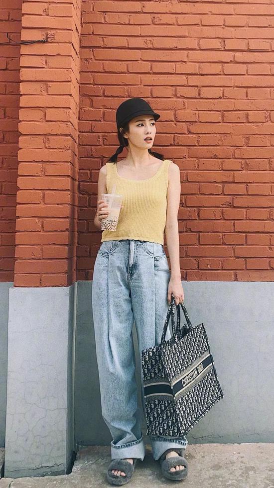 白鹿手拎Dior Book Tote托特包,复古的方形包身精致时髦,搭配简单的春日小背心、牛仔裤就已经与众不同。