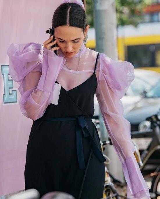 除此之外,拿来做紧身吊带连衣裙的内搭的穿法,最近倍受时尚博主们青睐。大家都喜欢用夸张一些的泡泡袖搭配修身连衣裙,it girl的首选穿法。