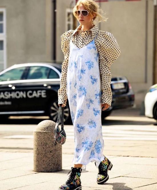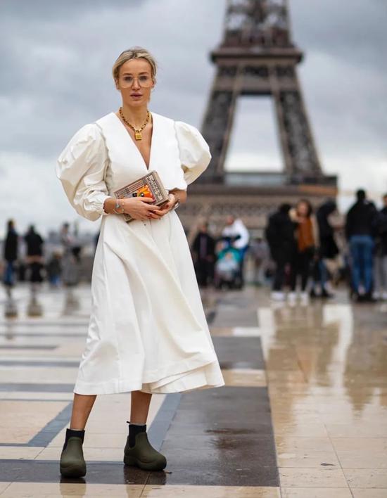 比如说在鞋子的选择上可以休闲运动一点。比如选择马丁靴或者切尔西靴做搭配,原本乖乖牌的泡泡袖,就个性十足。