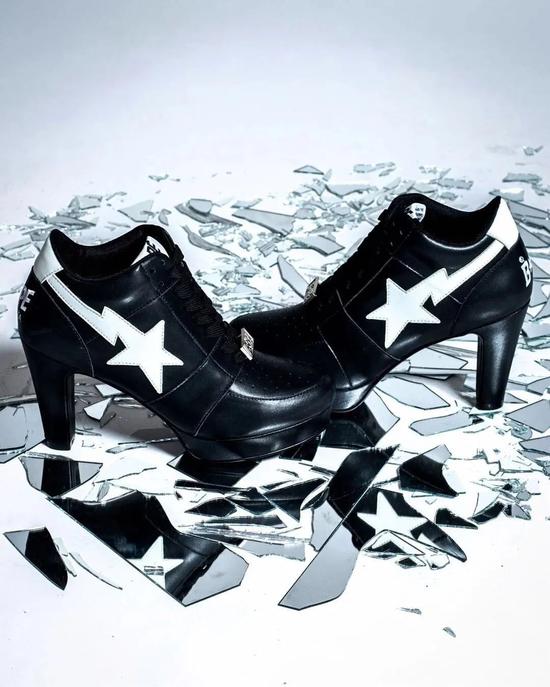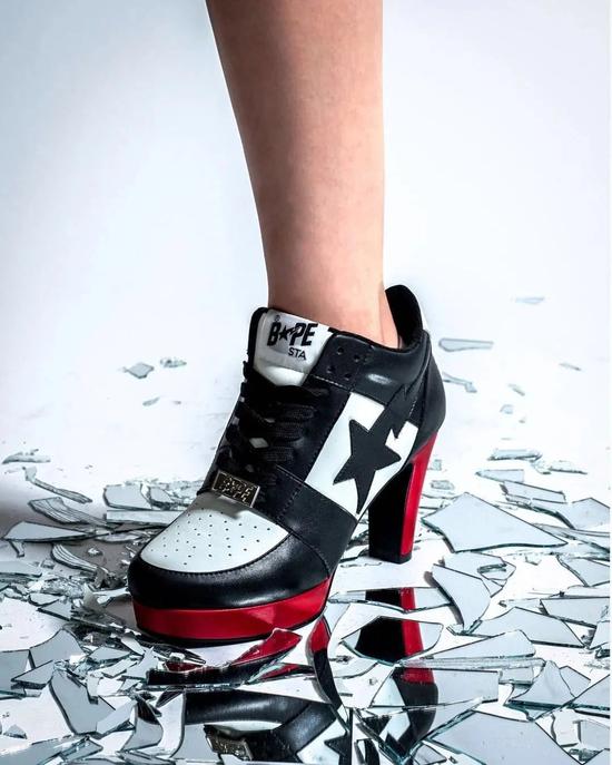 Bape为了庆祝BAPE STAR™诞生20周年,出了一双专门为姑娘们设计的“LADY BAPE STA”高跟球鞋。