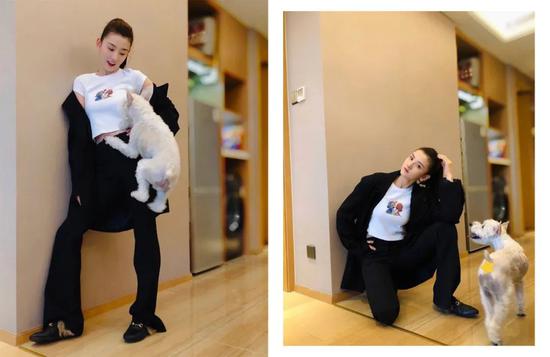 宋祖儿的修身短款白色短袖,带着点美式复古的感觉,搭配高腰裤能够拉长整体的比例;