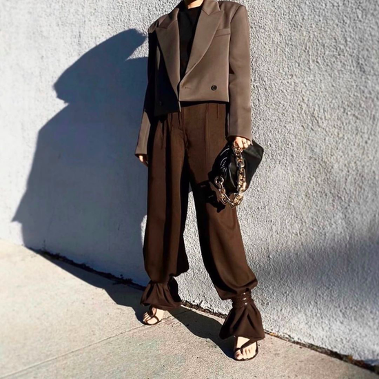 还记得去年开始流行的西装束腰穿法嘛?就是把西装扎进宽松的萝卜裤里,让长西装变短,让人视觉上看起来比例更加好。