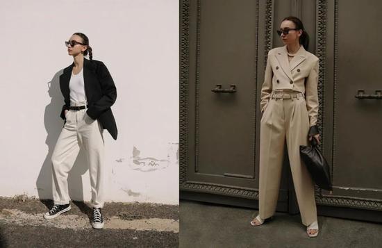 我对它产生下单冲动的原因之一是,很多小个子博主上身会很显高,看一下下面这个简单的对比图就能感受到,相比经典的西装长度,短款上衣搭配阔腿裤,简单pose出片率就很高;
