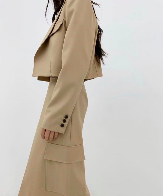 短款西装其实就是长度刚好卡在腰线的西装,它上半部分的设计就是西装本身,只是长度上做了调整;