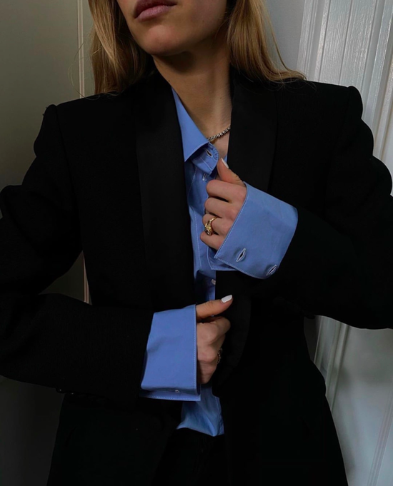 最为安全又有趣的选择其实就是一个亮色系的衬衫,比如这件清新蓝色的衬衫,搭配在黑色西装里,只需要变化颜色就能每天都不一样啦;
