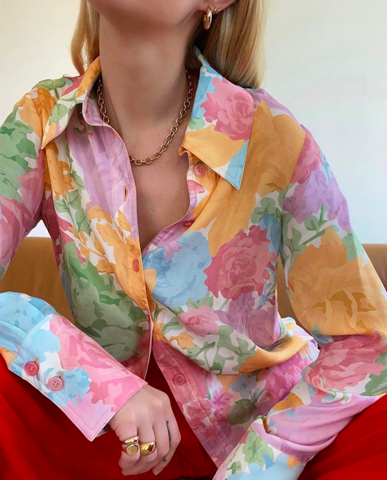 其实花花衬衫的选择有很多,比如配色丰富又看起来非常柔和的大花朵,远看还有一点油画的艺术质感;