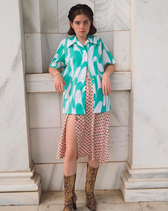 更错落有致的图腾,棋盘格也是一个使用率超高的选择,只是我觉得一旦花色变多,下装的搭配就一定要简单、色系清新的款式;