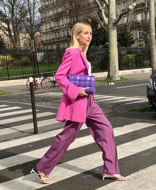 还可以选择相近色的搭配,紫色西裤搭配粉色上衣,少女挂的职场丽人们可以试起来,再搭配一双简洁的系带凉鞋,女人味十足又很耐看。