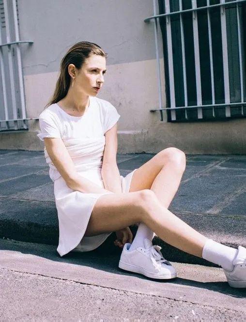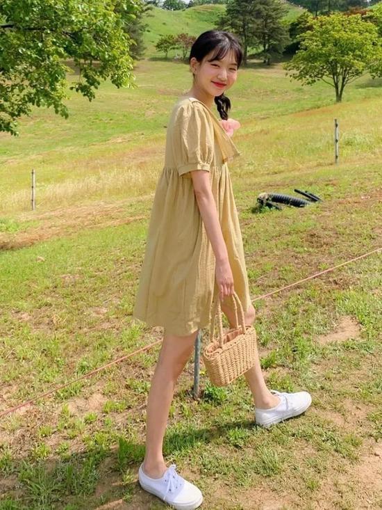 纯色连衣裙和运动鞋搭配,既青春俏皮,又有着一种文艺干净的清新气质,令人赏心悦目。