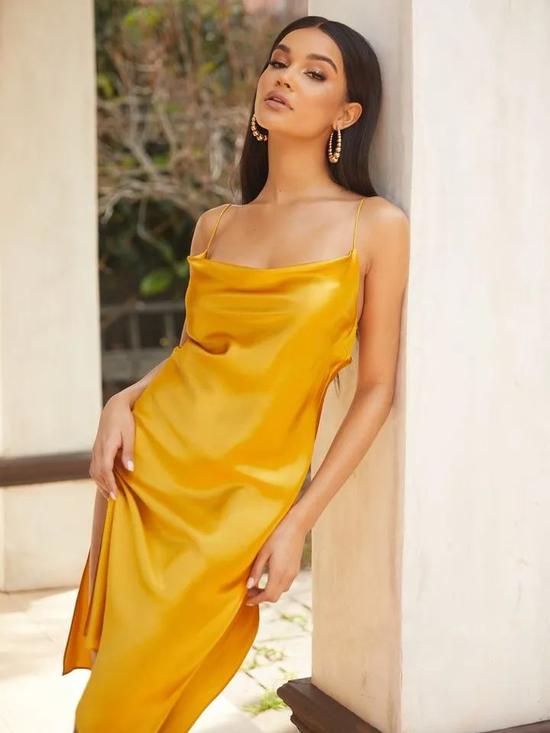 穿长款吊带裙时可以选择侧开叉的设计,既能秀出大长腿,还很显高。