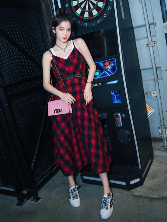 像钟楚曦搭配的绿白格纹吊带裙+运动凉鞋的组合,连衣裙穿起来不会单调,还有一种又酷又甜的混搭感。