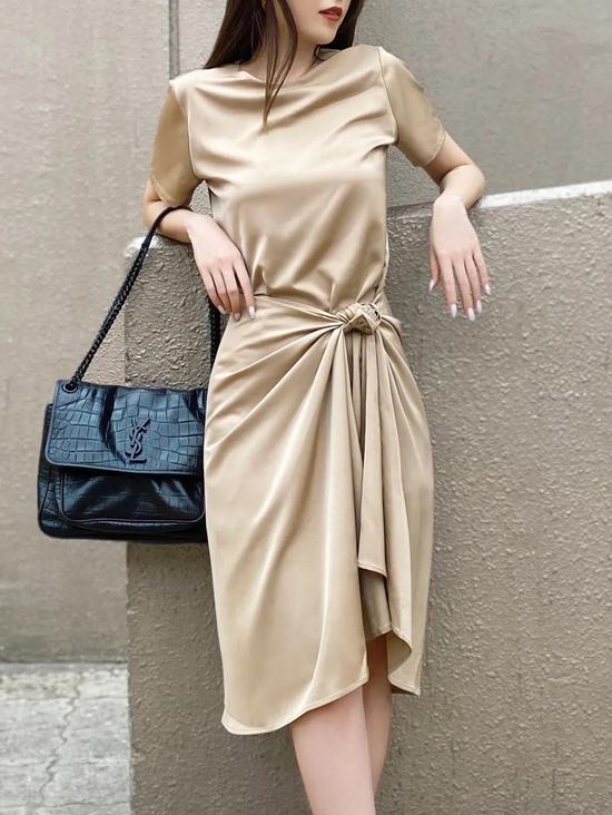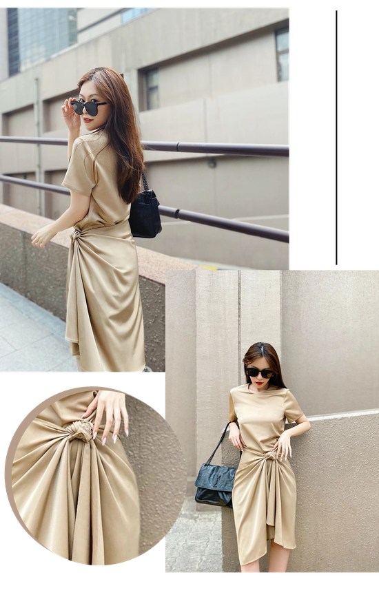 它的材质是很高级的缎面,配上低调的卡其色,像随意挂在身上的小礼服,增添点慵懒气质。