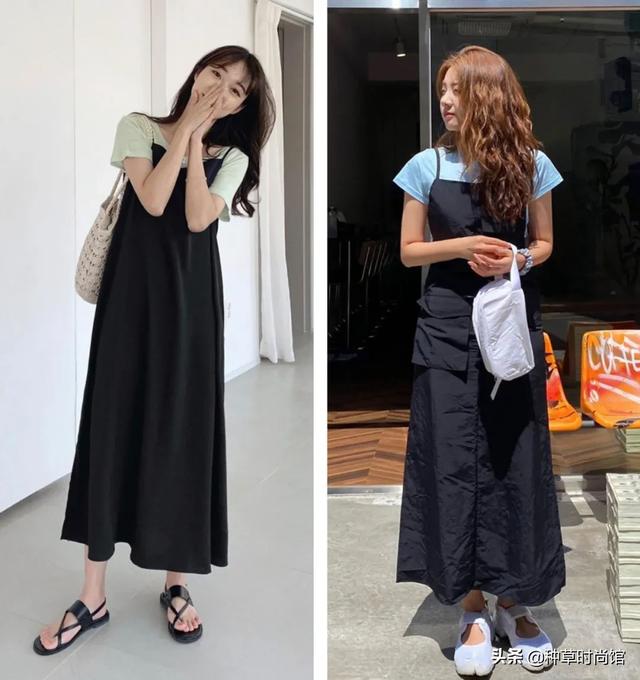 我首先想说的是吊带裙+T恤的组合,虽然比较基础普通,但穿上特别减龄,搭配帆布鞋,性感吊带也能元气满满。