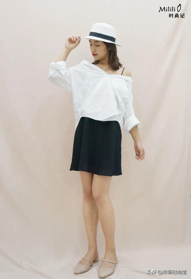 白衬衫的花式穿搭我教过很多遍了,这里选择的是衬衫一字肩穿法,用在吊带裙外特别适合,搭配小礼帽,瞬间有了自己的特色。