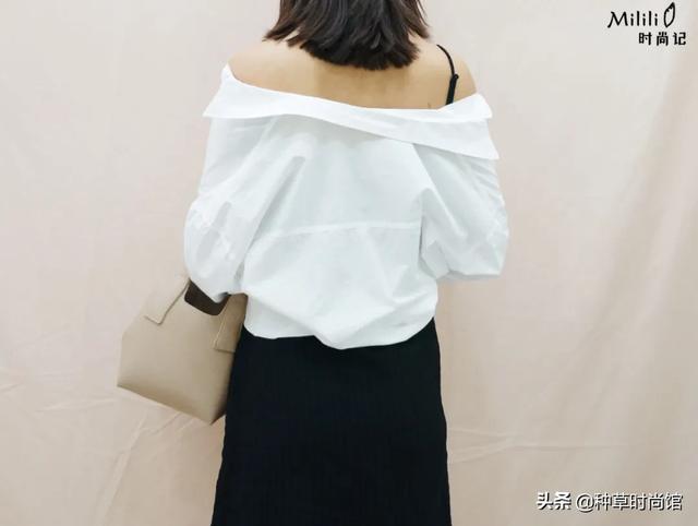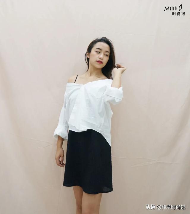 再来复习一遍衬衫一字肩的穿法,只扣下半部分的纽扣,然后把衣服提起来往后拉,有点像披肩的穿法,后面看大概是这个样子就可以,慵懒又性感,很适合和姐妹出门约下午茶。