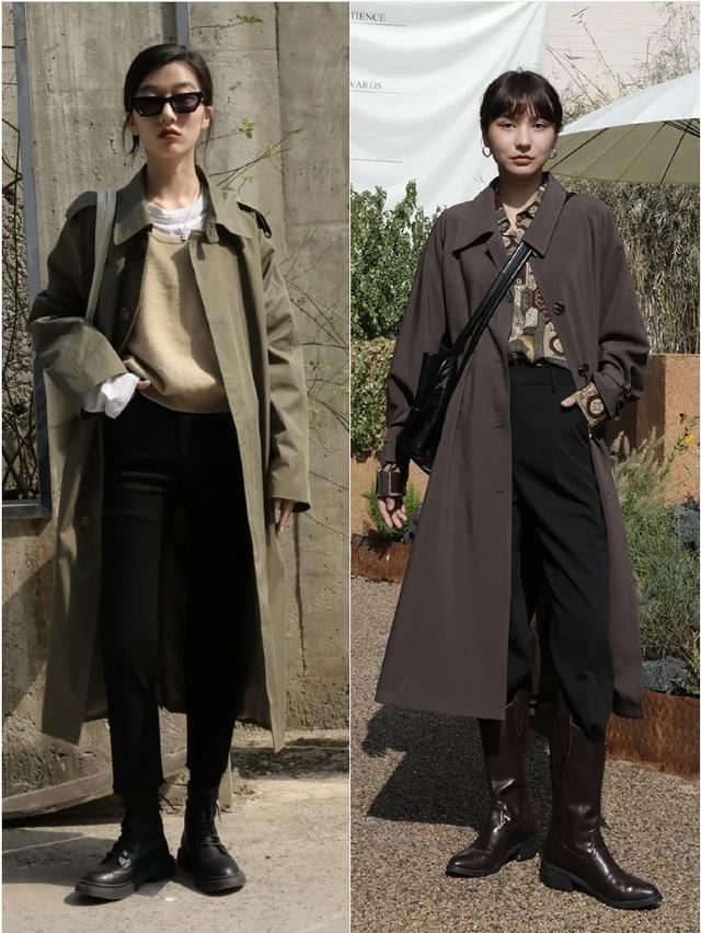 关门领的风衣,线条总是比较简洁,不同的领型穿出不同效果。领子较宽,显得大气简约,搭配宽松的廓形很合适。