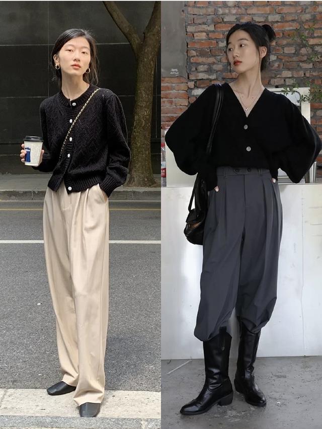 黑色短款奶奶衫,对小个子女生很友好,搭配宽松的阔腿裤,美得高级,又不失温柔。