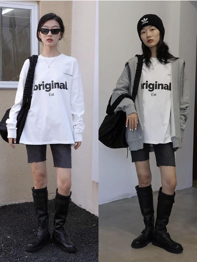 女生有干净的气质,穿什么简单衣服都很美,白色纯粹、干净,一条不收边的短裤,黑色长筒靴让简约的T恤,带上了街头的重金属摇滚味。