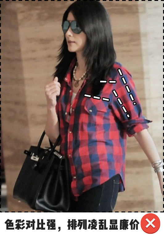 格纹的选择雷区我也讲了很多遍了,在这里就不多加赘述。反正一句话,格纹元素已经足够复杂,就不要“多此一举”,还在衣服的装饰上做负面功夫。