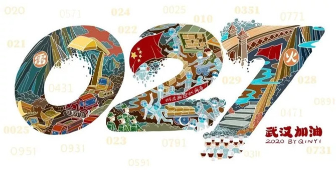 在他所绘作品中,以武汉区号027为主要元素的海报很是独特。上面绘有雷神山、火神山医院紧张忙碌开展施工,各方齐心协力运输防疫物资,医疗救援队驰援武汉等防疫现场,定格在027三个阿拉伯数字内。